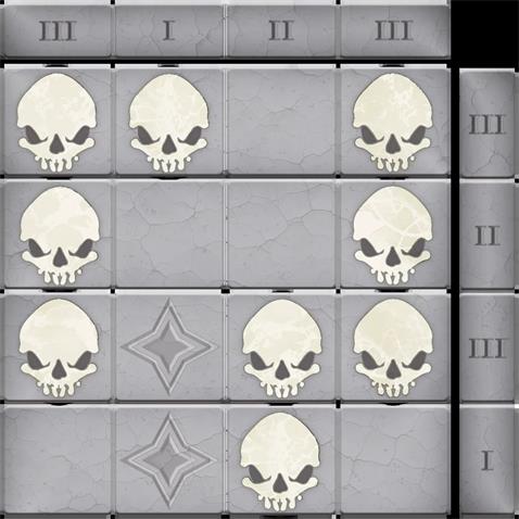 如谜题资料 3(见本章末尾)所示,九颗矮人头骨放在一个 1 尺见方瓷砖网格附近。网格中的列和行都标有 I、II 或