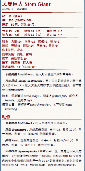 如果你想让你的玩家在第十二章中使用风暴巨人NPC,将以下风暴巨人storm giant的属性表复制四张,并将这些属性表分发给玩家们。如果你有四个以上的玩家,那么不是每个玩家都能得到一个风暴巨人NPC。