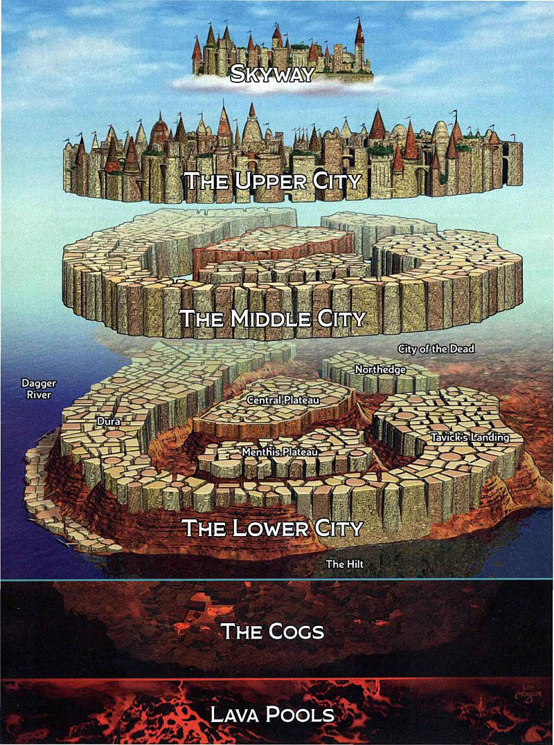 每一个层区又被细分为分区,这些分区是根据经济类型或独特文化命名的,或者同时根据两者特点一起命名。比如下层北边区分为石料区,长梯区和北方大市场区。通常来说,根据一个分区的名字和该区所在的层级,你就能想到那里会有什么了。一个上层中央高地区的分区井井有条,到处都是警卫;而在下层杜拉区,则充满了污秽和危险。